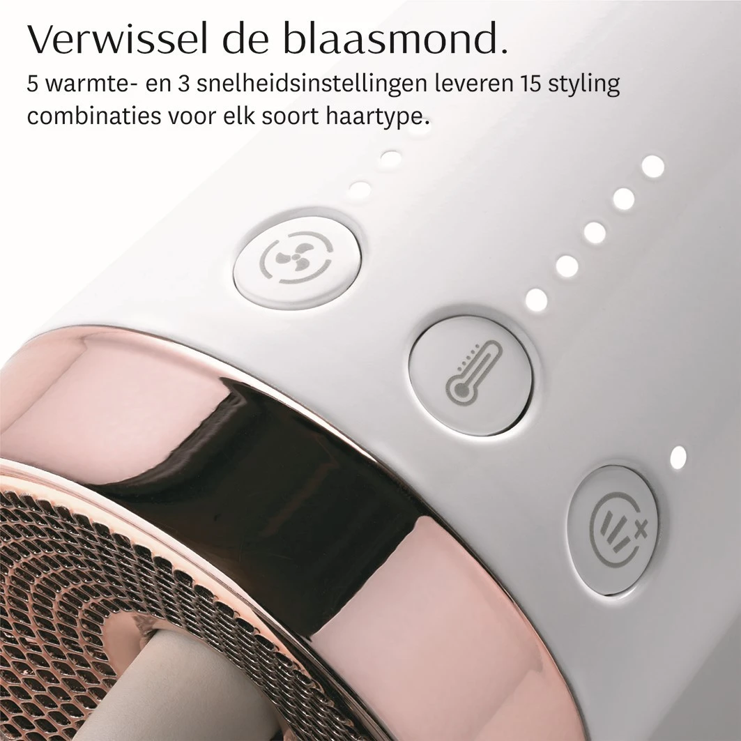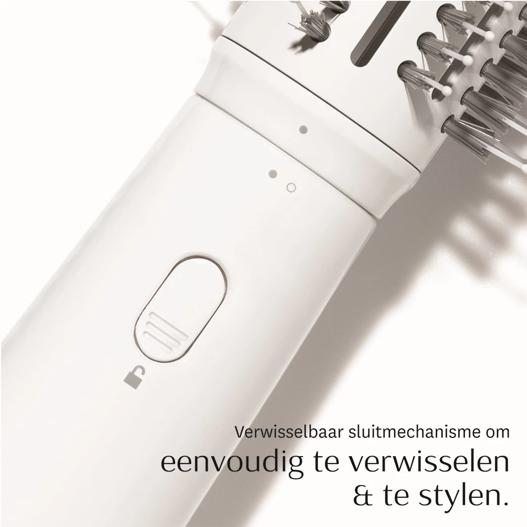 De drogerborstel helpt kroeshaar glad te strijken. Ontworpen als een vervangbare borstel met twee doppen en 15 mogelijke combinaties van temperatuur en snelheid voor elk type en textuur van het haar. Gebruik een ronde borstel voor een opvallende, high-volume look, of een paddle brush voor een gladde, glanzende haarstyling.