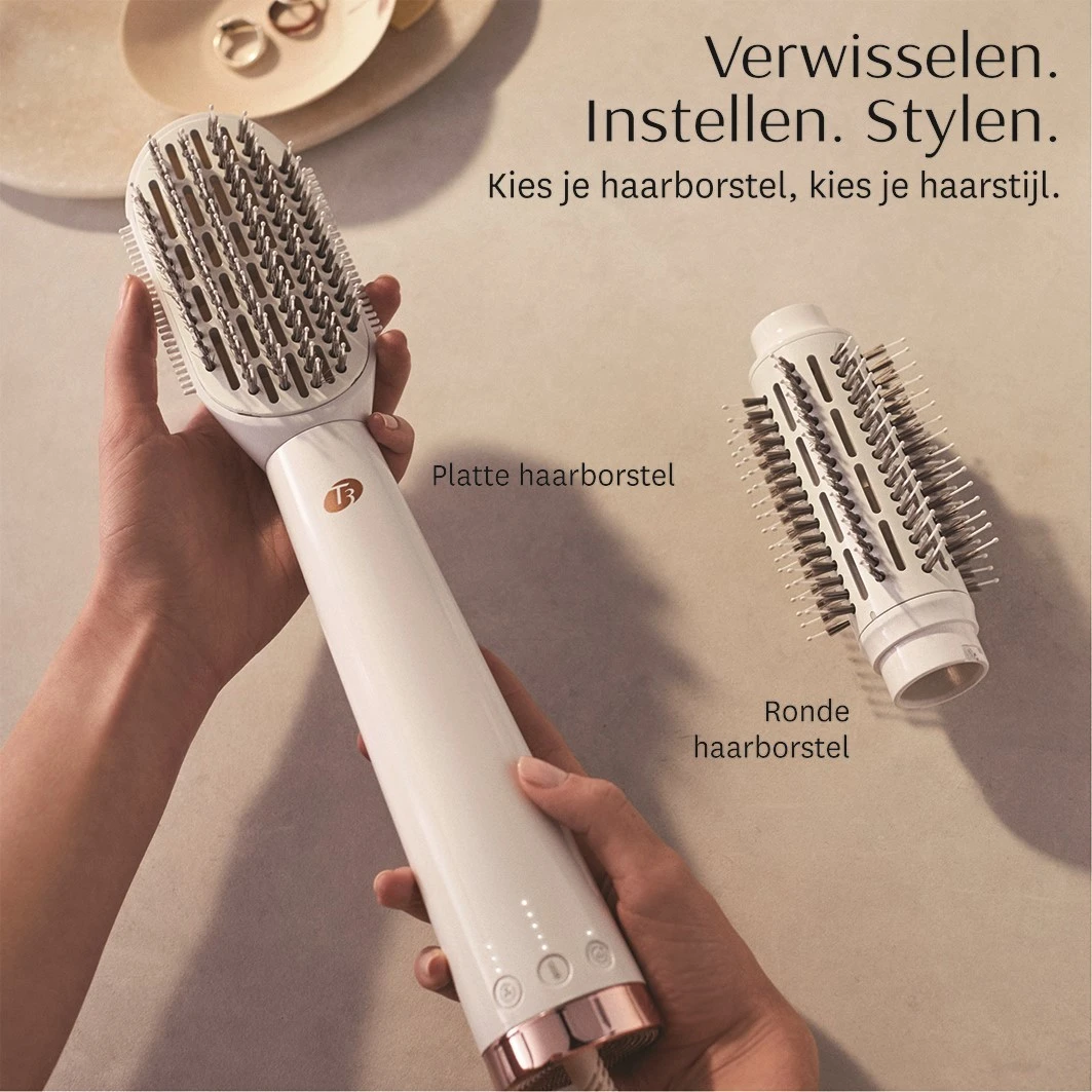 Het product, dat de Allure Best of Beauty award won, biedt een heel scala aan haarstyling met verwisselbare doppen: van glad en glanzend tot vol volume en golvend. T3 AireBrush Duo biedt glanzende resultaten zonder kroezen – voor steil, golvend en kroeshaar. De drogerborstel helpt kroeshaar glad te strijken.