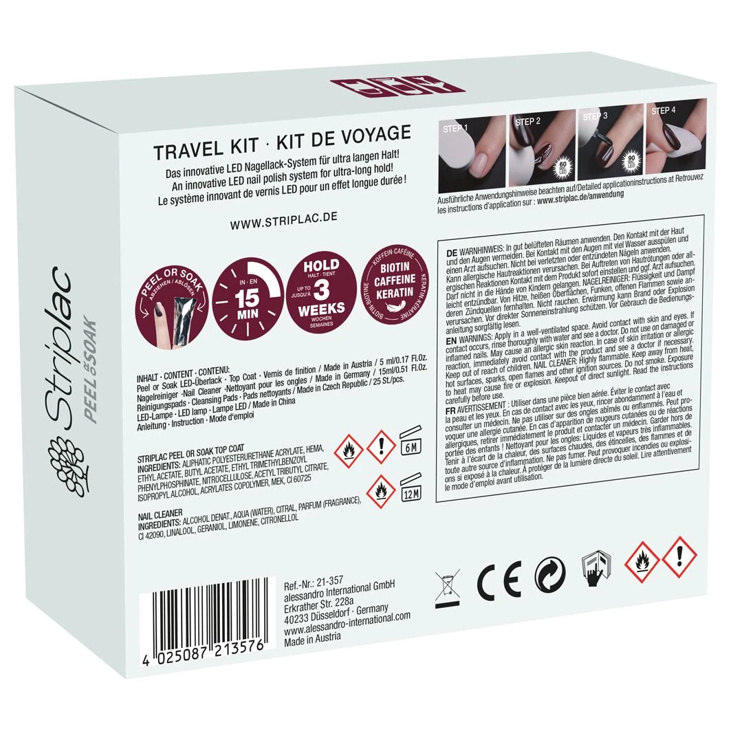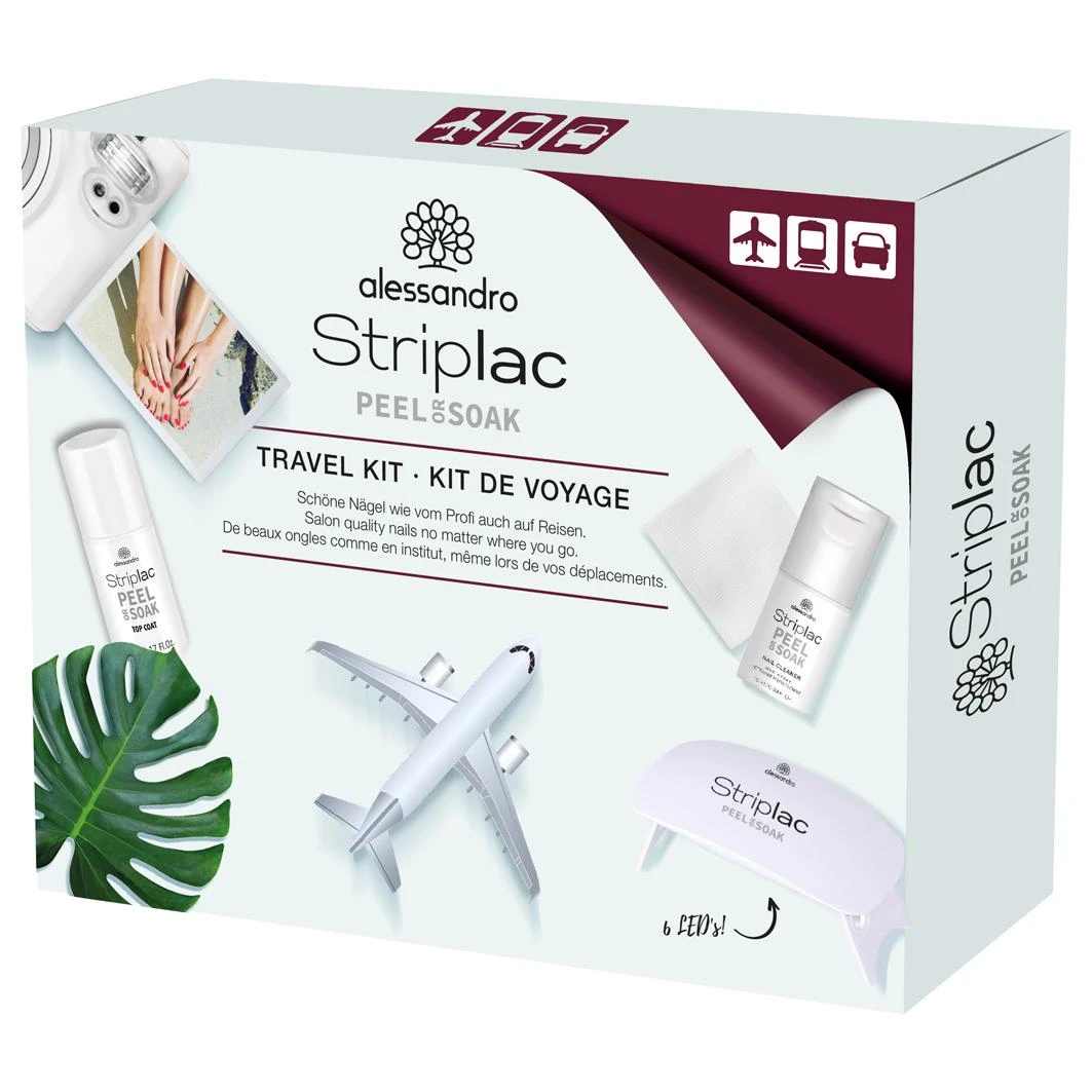 Zon vol zand op de zee – met perfect gestylede Striplac nagels wordt elke vakantiefoto een absolute blikvanger en met de Striplac Peel of Soak Travel Kit van alessandro heb je de perfecte tools! De meegeleverde mini-LED-lamp is de ideale basis voor een professionele manicure met de innovatieve Striplac Peel of Soak, die belooft tot 3 weken mee te gaan en op twee ongecompliceerde manieren weer kan worden verwijderd. De mini-reislamp kan eenvoudig worden aangesloten op een USB-interface en garandeert een optimale uitharding met 6 krachtige LED’s. De uitklapbare beugels zorgen voor een veilige stand en comfortabele bediening. Een Striplac Top Coat, een Striplac Cleaner en Spriplac Pads ronden de unieke set vakkundig af – nu heb je alleen nog je favoriete kleur nodig en de wereldreis met Striplac kan beginnen!