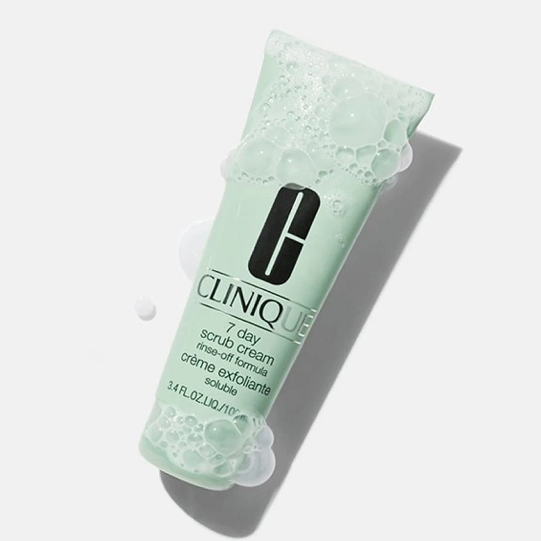 De 7-Day Scrub Rinse-Off Cream van Clinique is een scrub op crèmebasis met fijne exfoliërende korreltjes, die de huid polijsten, zachter en gladder maken. Deze crème ontdoet uw gezicht van schilfertjes en vermindert de fijne lijntjes, voor een heldere, stralende huid. Tevens zorgt het voor een egale teint en helpt het overtollige talgafscheiding onder controle te houden, de gezichtsscrub bereidt uw huid voor op hydratatie en make-up kan na gebruik makkelijker worden aangebracht.