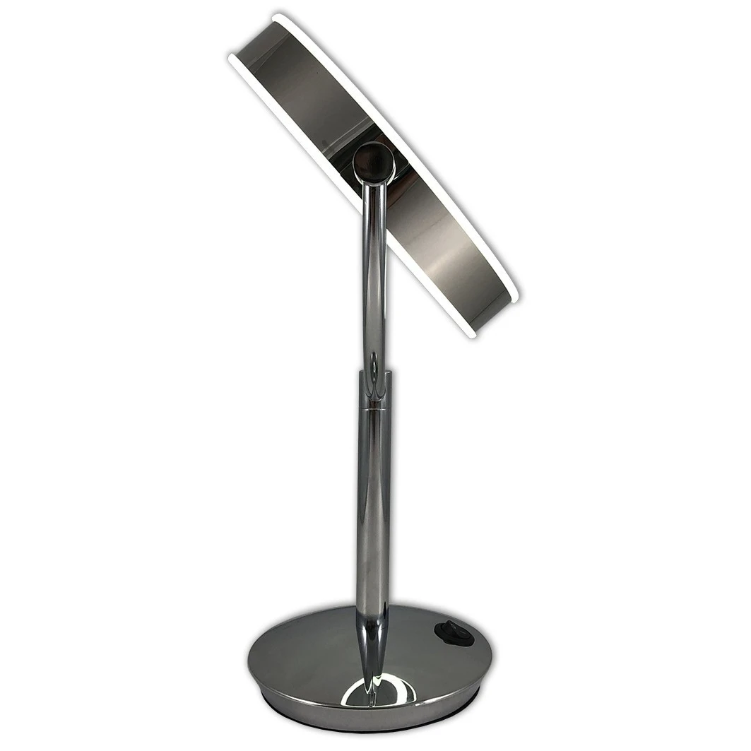 De Dubbelzijdig Verlichte Staande Spiegel 10x is een strakke en uiterst stevige metalen make-upspiegel die voorzien is van LED. De LED verlichting maakt deze spiegel niet alleen energiezuinig maar geeft ook nog eens een helder wit daglicht af, hierdoor kunt u zich perfect opmaken, epileren of uw lenzen aanbrengen. Deze spiegel van Gerard Brinard werkt op 4 AA batterijen of is te gebruiken met de USB stroomkabel, beide worden meegeleverd. De spiegel is vanaf beide zijden te gebruiken, met aan de ene zijde een normale vergroting en aan de andere zijde een 10x vergroting. U kunt de spiegel zelf roteren zodat u makkelijk kunt switchen tussen de normale en de vergrotende kant. De spiegel heeft een doorsnee van 19 cm.