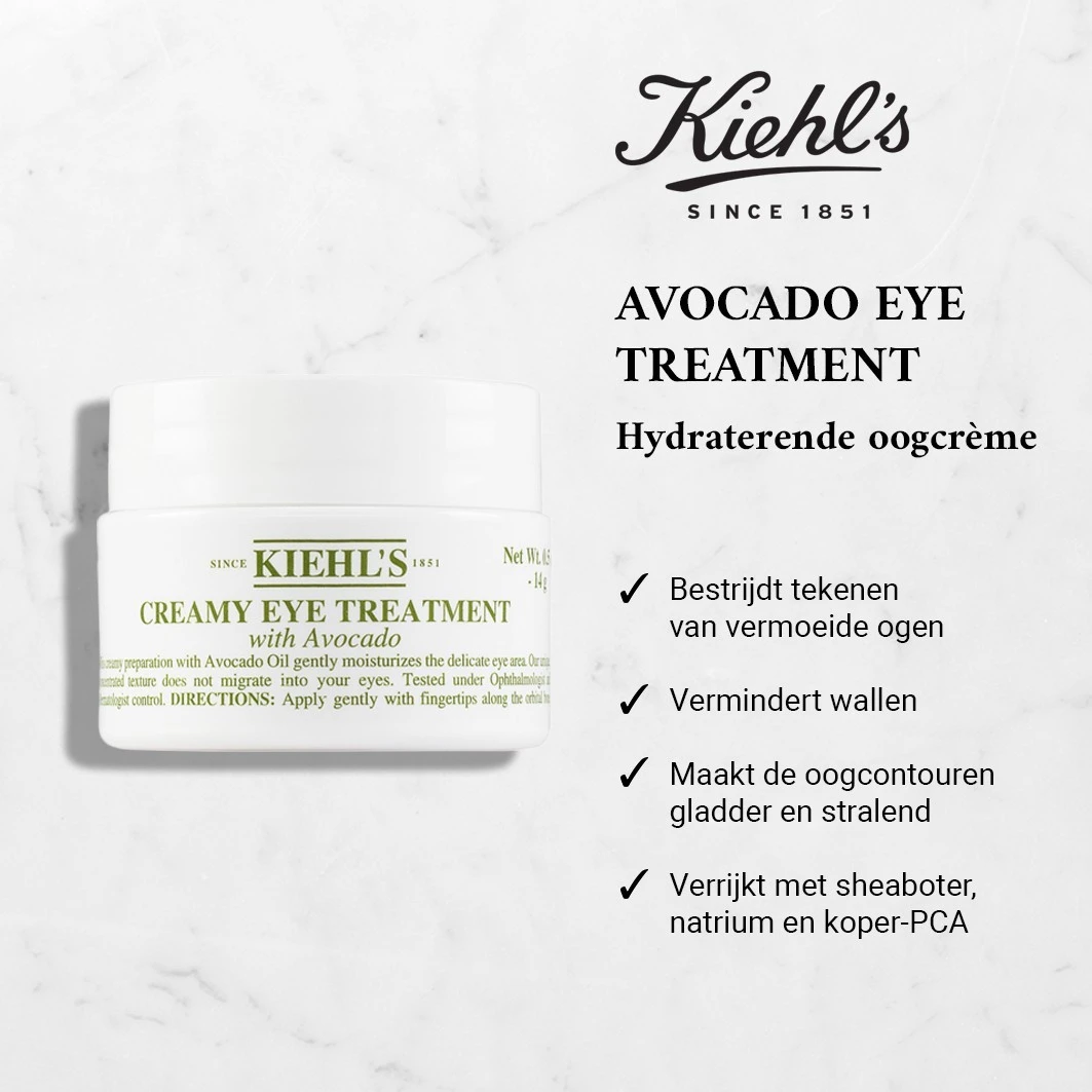 Kiehl’s Avocado Eye Treatment hydrateert effectief en is geschikt voor alle huidtypes, zelfs voor een gevoelige huid. De gevoelige huid rondom de ogen wordt beschermd en gedurende de hele dag gehydrateerd. Daarnaast draagt de crème bij aan een verbeterde huidtextuur.
