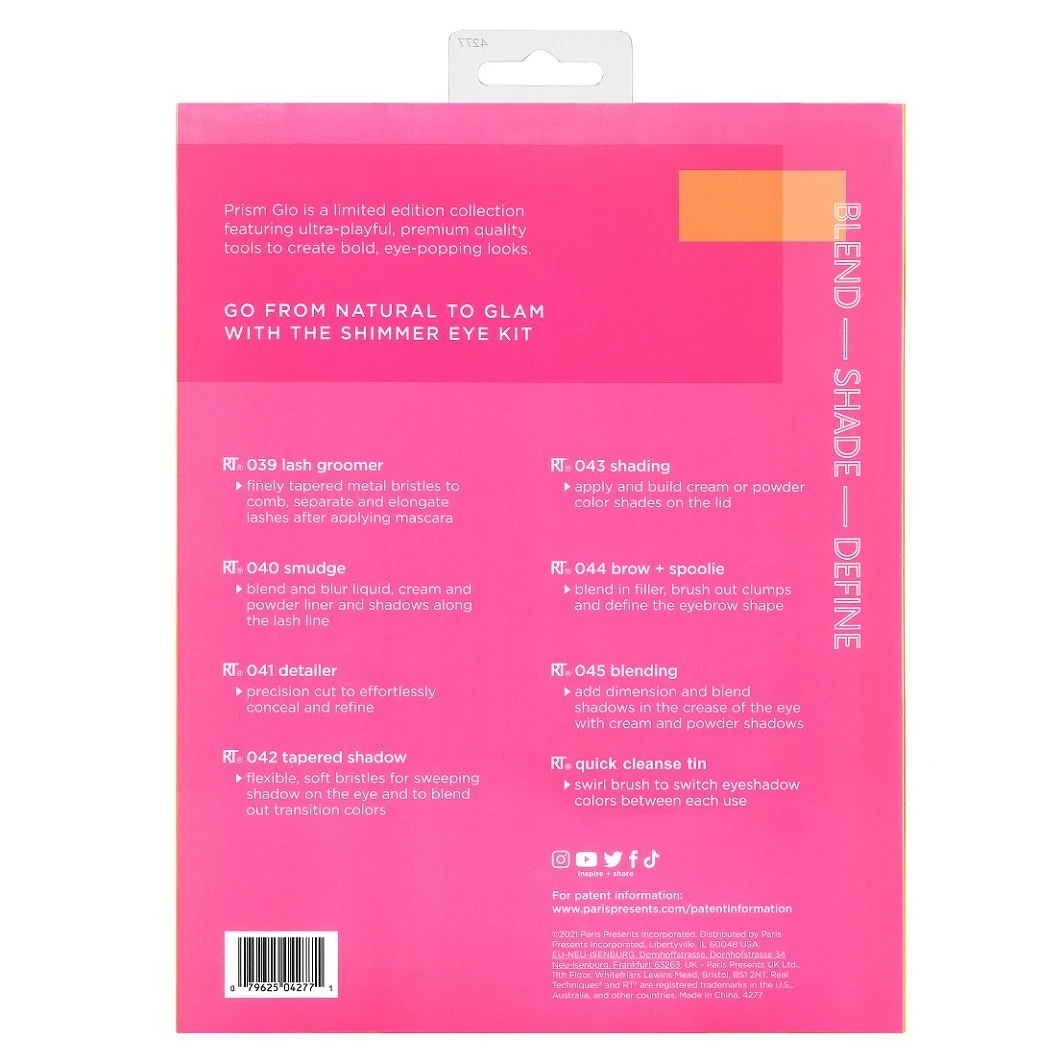De Real Techniques Prism & Glo collectie heeft een krachtige look en bestaat uit ultrazachte penselen voor een full glam look. De collectie heeft een exclusief design met vederlichte haartjes van premium kwaliteit en hoogwaardige handvaten voor een soepele aanbreng van make-up. De achtdelige Shimmer Eye Set bevat alle make-uptools voor een intense ooglook. De set bevat een Lash Groomer, Smudge Brush, Detailer Brush, Tapered Shadow Brush, Shading Brush, Brow & Spoolie Brush en een Quick Cleanse Tin om de kwasten tussen gebruik schoon te maken.