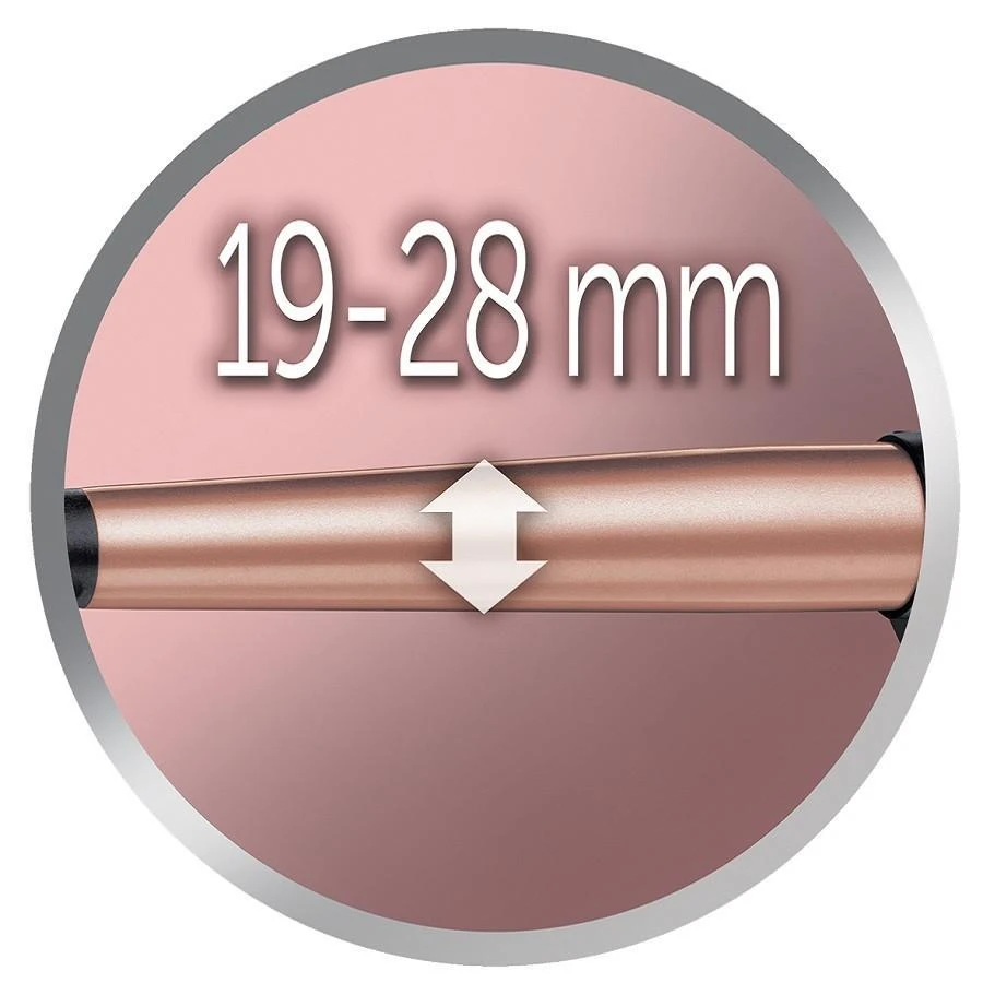 De krultang van 19-28 mm doorsnee creëert indrukwekkende krullen en verleidelijke slag. Dankzij het ontwerp van de krultang kunt u uw haar moeiteloos stylen van de aanzet tot de punten. Met behulp van de verbeterde griptechnologie glijdt het haar niet meer van de krultang af. Selecteer de PRO+-stand van 185°C om het haar nog gezonder te stylen: ook met de meest fijne, tere haren bereikt u voortaan een oogverblindende look die lang houdt. Superkrullen. Supersterk. Superstijlvol.